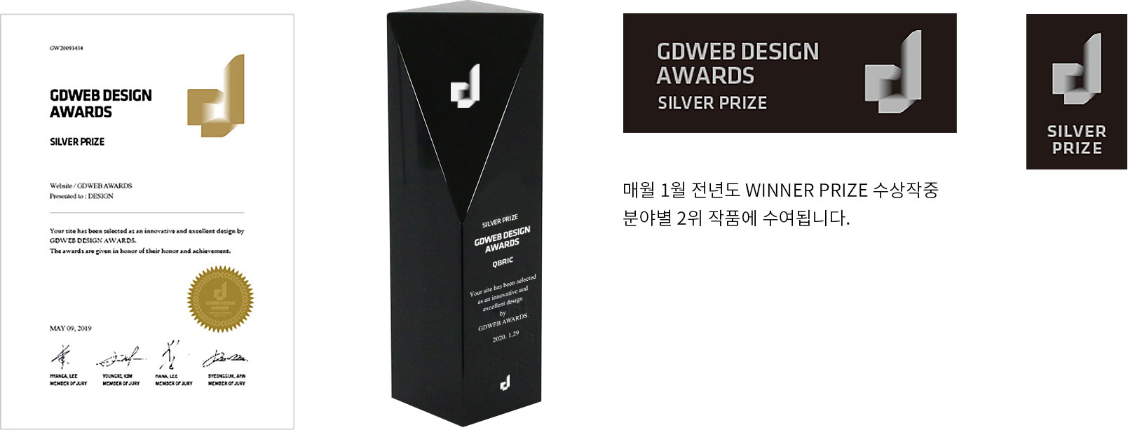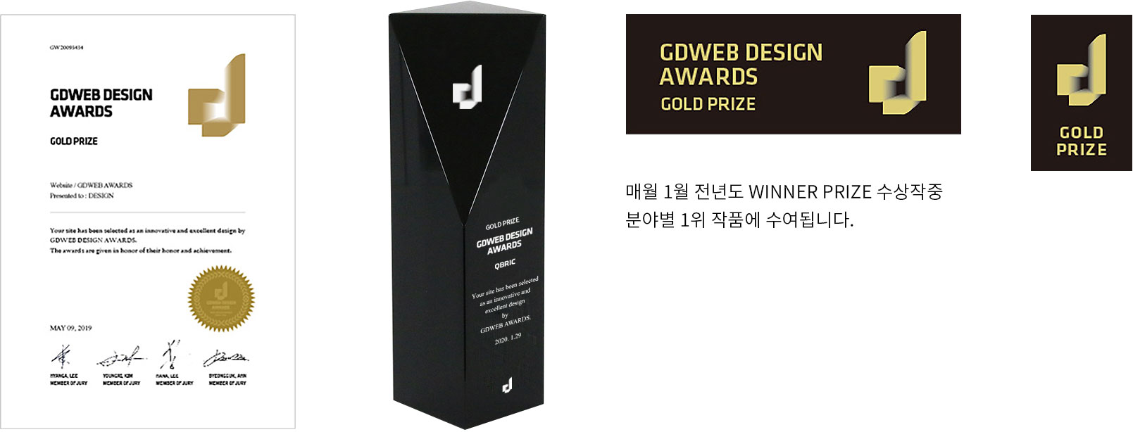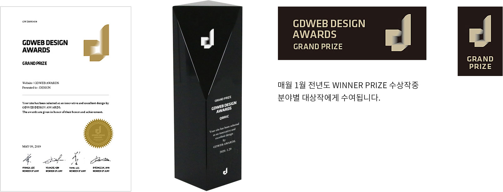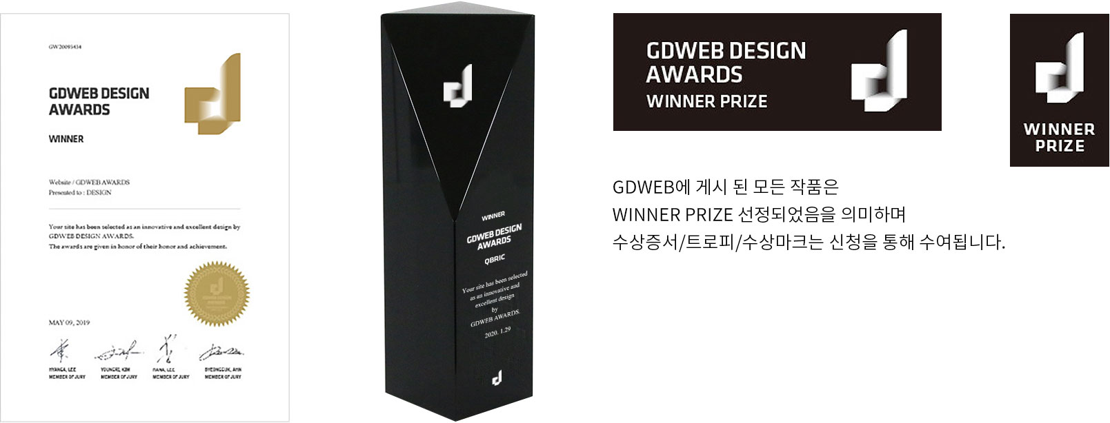 수상증서와 트로피는 우편으로 발송되며, 수상마크는 메일을 통해 발송됩니다. (GDWEB에 선정 게시된 웹사이트들은 WINNER 수상으로 발급됩니다)